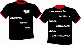 ESSA FOI A PRIMEIRA CAMISETA QUE EU FIZ QUATRO PALAVRAS QUE EU PRECISEI USAR DESDE DO PRIMEIRO DIA QUE DECIDI FAZER A GASTROPLASTIA E EU VOU PRECISAR ATÉ O DIA DA MINHA CIRURGIA.E ASSIM QUE EU TIVER ALTA DO HOSPITAL SAIREI COM ELA "OBESIDADE NUNCA MAIS GASTROPLASTIZADO COM ORGULHO...VIVA A GASTROPLASTIA